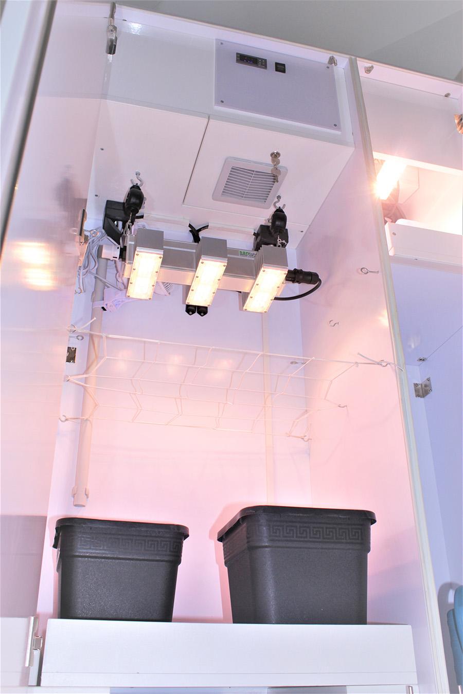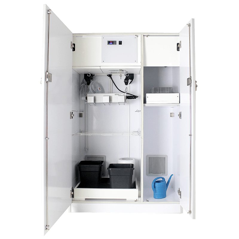 Bestehend aus zwei Fächern mit einer Sanlight Q3W Gen 2 LED und einer Sanlight Q1W LED. Mit einem Fach für die Pflanzen zum wachsen/blühen und einen gesonderten abgetrennten höhenverstellbaren Fach z.B. für Samen, Sämlinge und Stecklinge zum vorziehen (Q1).