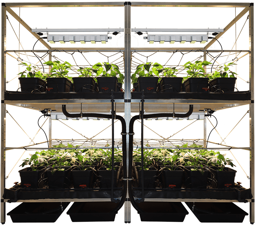 Das auf beiden Stockwerken ausgelegte 4 x 4 Bewässerungssystem ist auf maximal 16 Pflanzen pro Stockwerk so konzipiert, dass der Druckabgleich auf allen angeschlossenen Schläuchen gleich groß ist. Sie können jeweils 4 Schläuche über ein Absperrhahn separat regeln. So ermöglicht es Ihnen, verschiedene Einstellmöglichkeiten für Nährstoffverbrauch und Medien (Erde, Coco und Hydro Kultur).